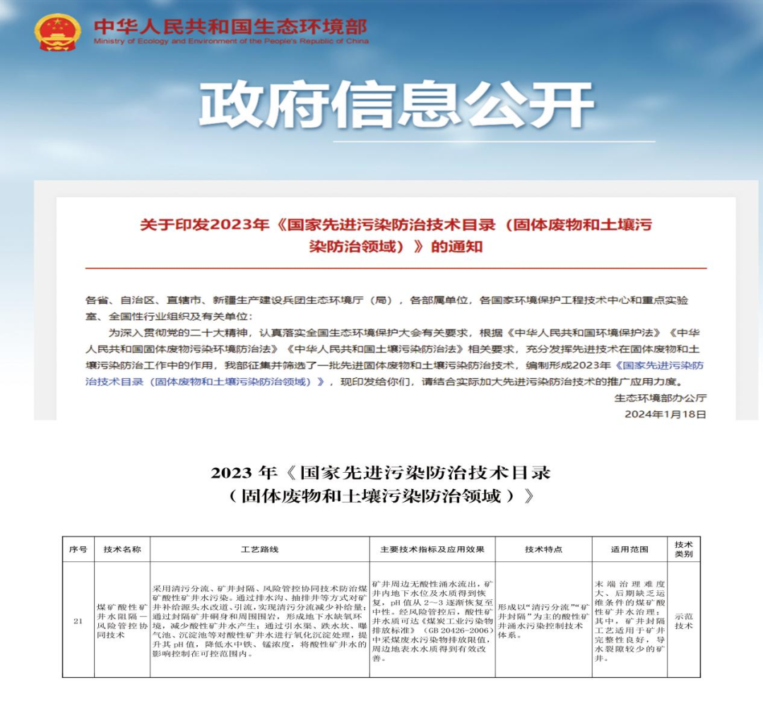 近期,生态环境部发布2023年《国家先进污染防治技术目录(固体废物和土壤污染防治领域)》(以下简称《目录》) 。由清新环境子公司四川省天晟源环保股份有限公司(简称“天晟源环保”)自主研发的“煤矿酸性矿井水阻隔-风险管控协同技术”成功入选该目录。